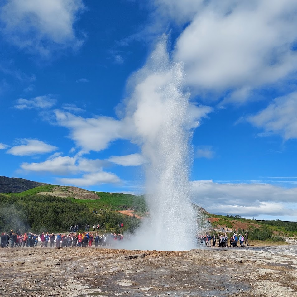 Започваме с южната част на острова и известния Golden Circle, което е нещо като Исландия за един ден от Рейкявик и съответно е най-оживен от туристи. На снимката горе Национален парк Thingvellir и границата между Северноамериканската и Евроазиатската тектонски плочи, а долу: гейзерът Strokkur.