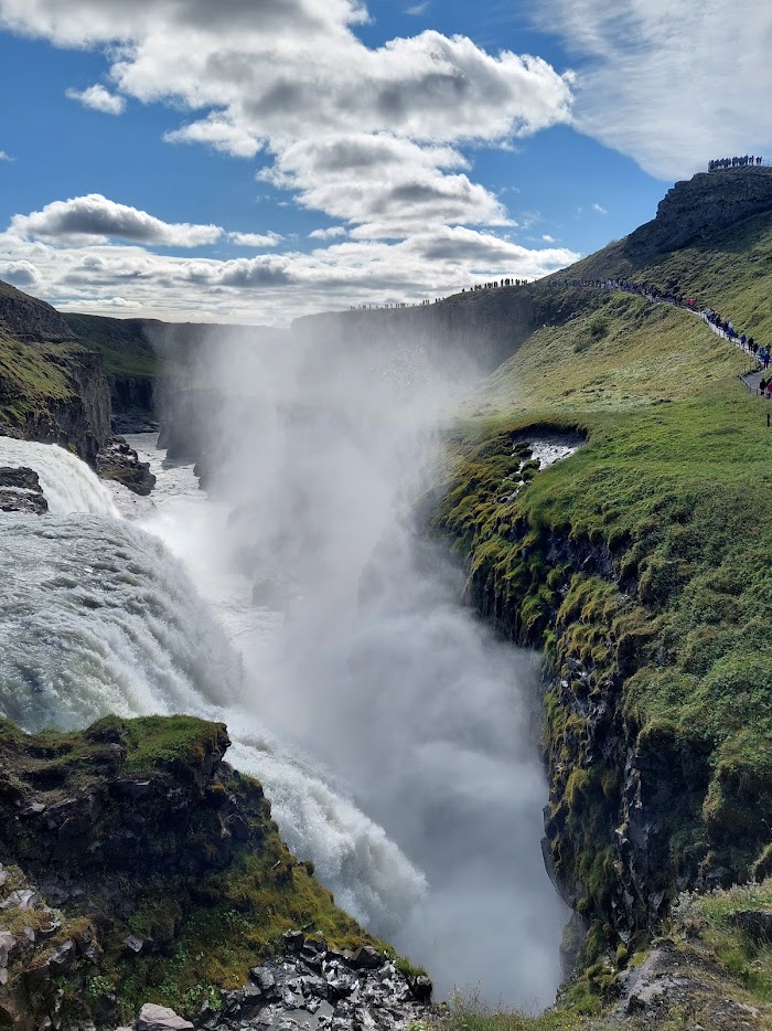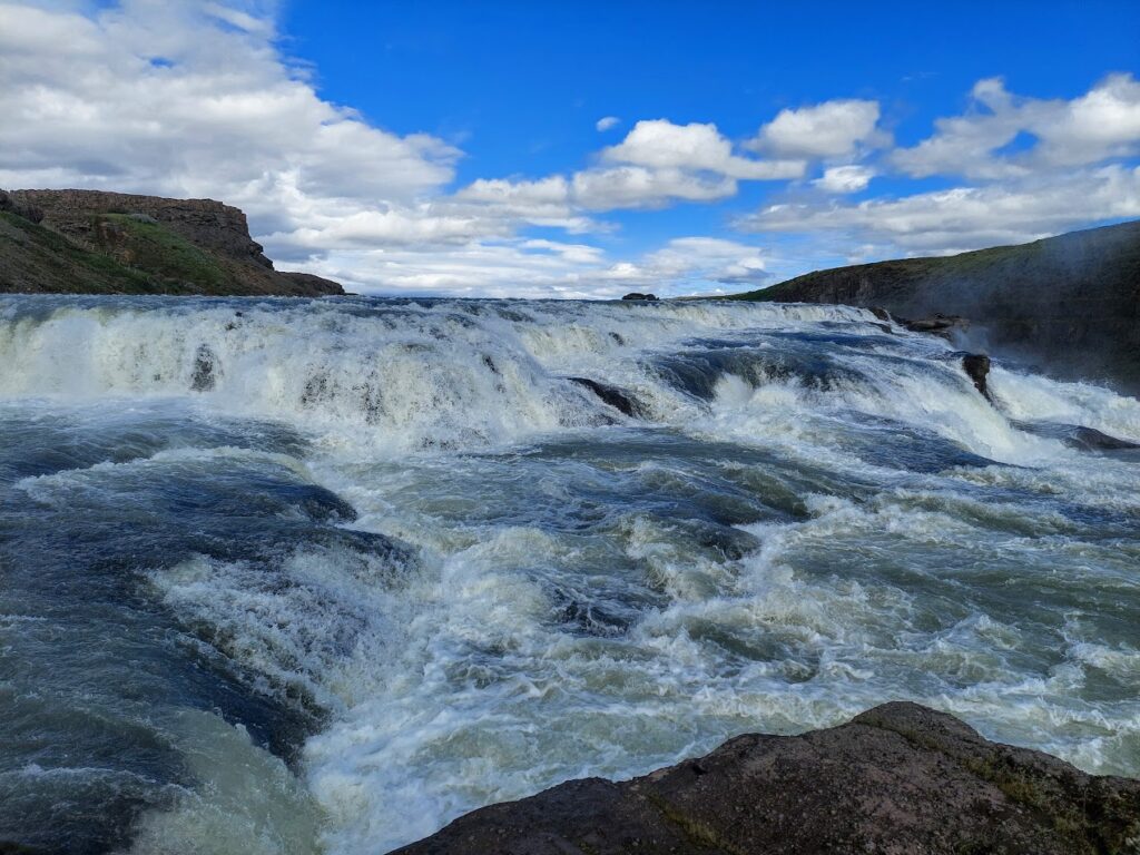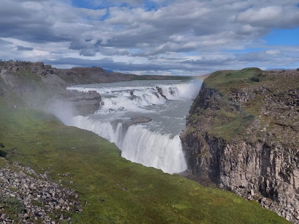 Gullfoss, Златният водопад. Разпенените води на Хвита образуват цял облак от воден прах, който под косите лъчи на слънцето се “позлатява”. През деня пък има дъга.