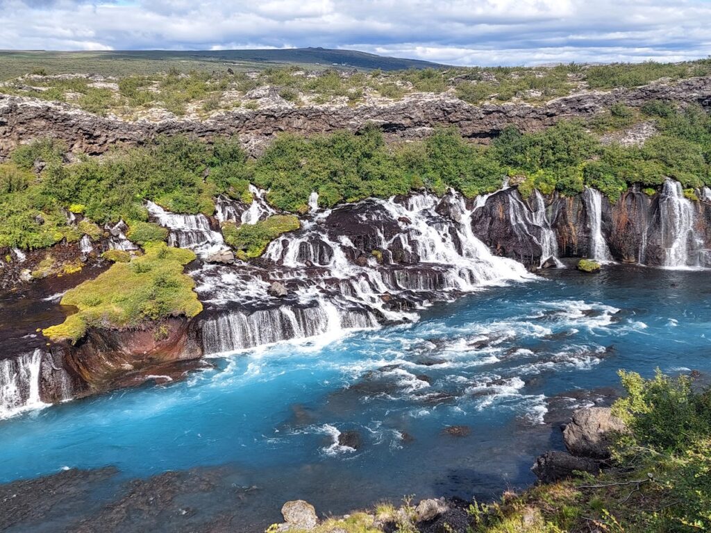 Hraunfossar. Реката си е проправила път сред лавата и безброй водопадчета извират от средата на склона.