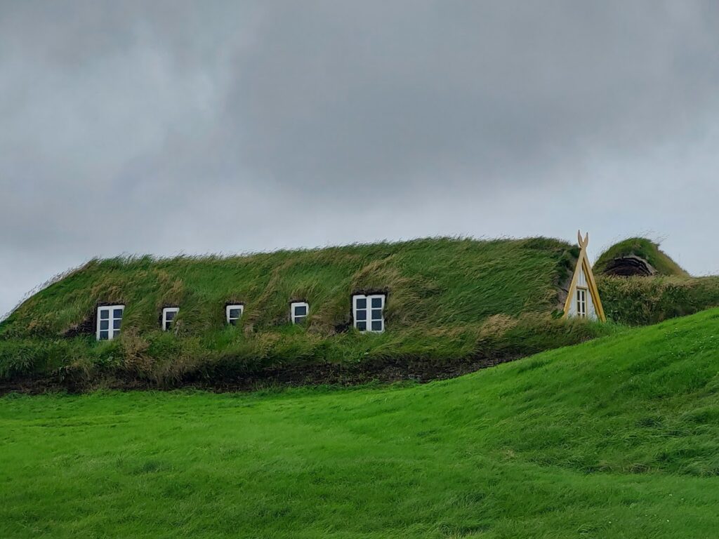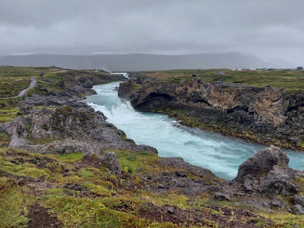 Glaumbær Turf Farm & Museum, а долу водопадът Goðafoss.